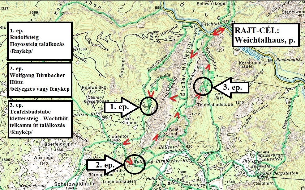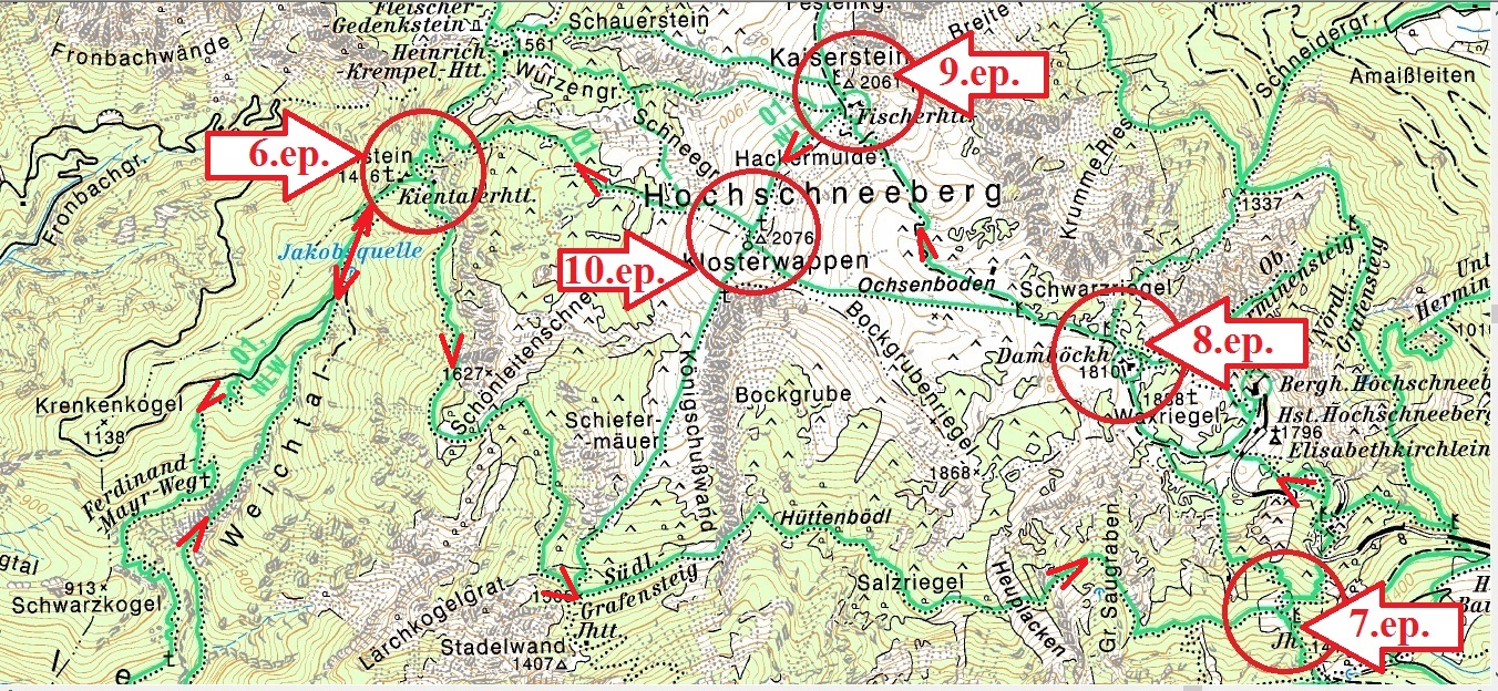 Weichtal Haus  Grosses Höllental  Hoyosteig  Dirnbacher Hütte  Schweibwaldhöhe  Trinksteinsattel  Neue Seehütte  Preiner Wand  Otto Haus  Wachthüttelkelamm  Weichtal Haus  Weichtalklamm  Kientalerhütte  Grafensteig  Elisabethkischlein  Berghaus Hochschneeberg  Damböck Haus  Fischer Haus  Klosterwappen  Kienthalerhütte  Jakobs quelle  Ferdinand Mayr Weg  Weichtal Haus