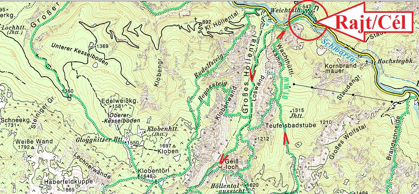 Weichtal Haus  Klobenwand  Klobentörl  Gaislochboden  Gaisloch steig  Teufels-Badstube  Loswand  Wachthüttelklamm  Weischtal Haus