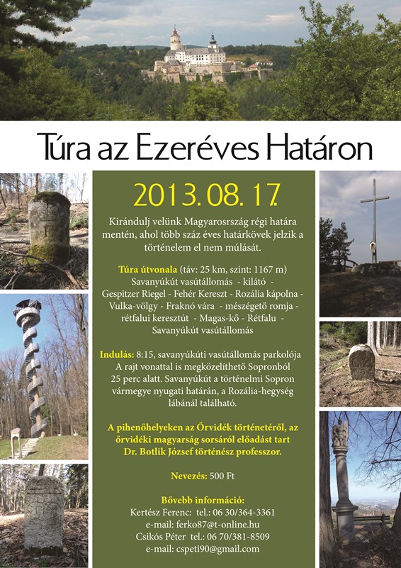A túra közel fele az ezeréves határon, több száz éves határkövek között zajlik! A pihenőhelyeken az Őrvidék történetéről, az őrvidéki magyarság sorsáról előadást tart Dr. Botlik József történész professzor.