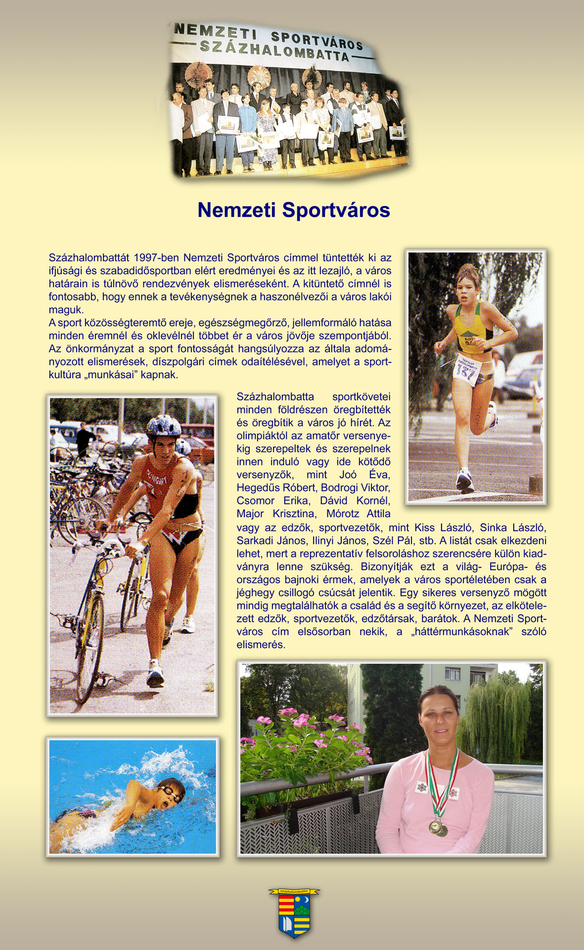 Az 1920 évektől folyamatosan fejlődő sportélet, az elért eredmények tették ismertté a várost országos és nemzetközi szinten is. Az 1970-től városi rangot kapott település sportlétesítményeinek építésében jelentősen hozzájárultak a nagyvállalatok is. Különösen dinamikus a fejlődés az 1990-től kezdődött önkormányzati időszakban. A város jó anyagi feltételekkel, ugyanakkor a jövőért érzett felelősséggel kötelezte el magát a sport ügye mellett. Százhalombatta élt a lehetőségekkel, amit az 1997-ben elnyert "Nemzeti Sportváros" kitüntető cím is bizonyít. Százhalombatta a sportolásra és a szabadidő hasznos eltöltésére, mára a lehetőségek tárházát kínálja a Városi Szabadidő Központban is (pl. vízi sportok, kajak-kenu labdajátékok, úszás, lövészet). Hazai és nemzetközi mérkőzéseknek, versenyeknek, bajnokságoknak ad teret a város, és büszke számos kiváló sportolójára.