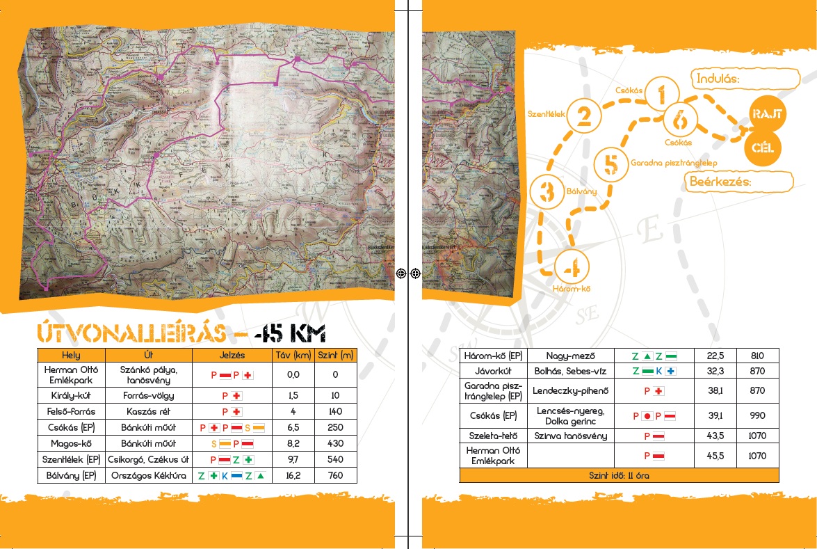 Szintidő: Az utolsó 45km-es versenyző legkésőbb 9-kor indulhat és szintidőn belül kell megérkeznie, azaz 9+11 óra, ami este 8 óra.