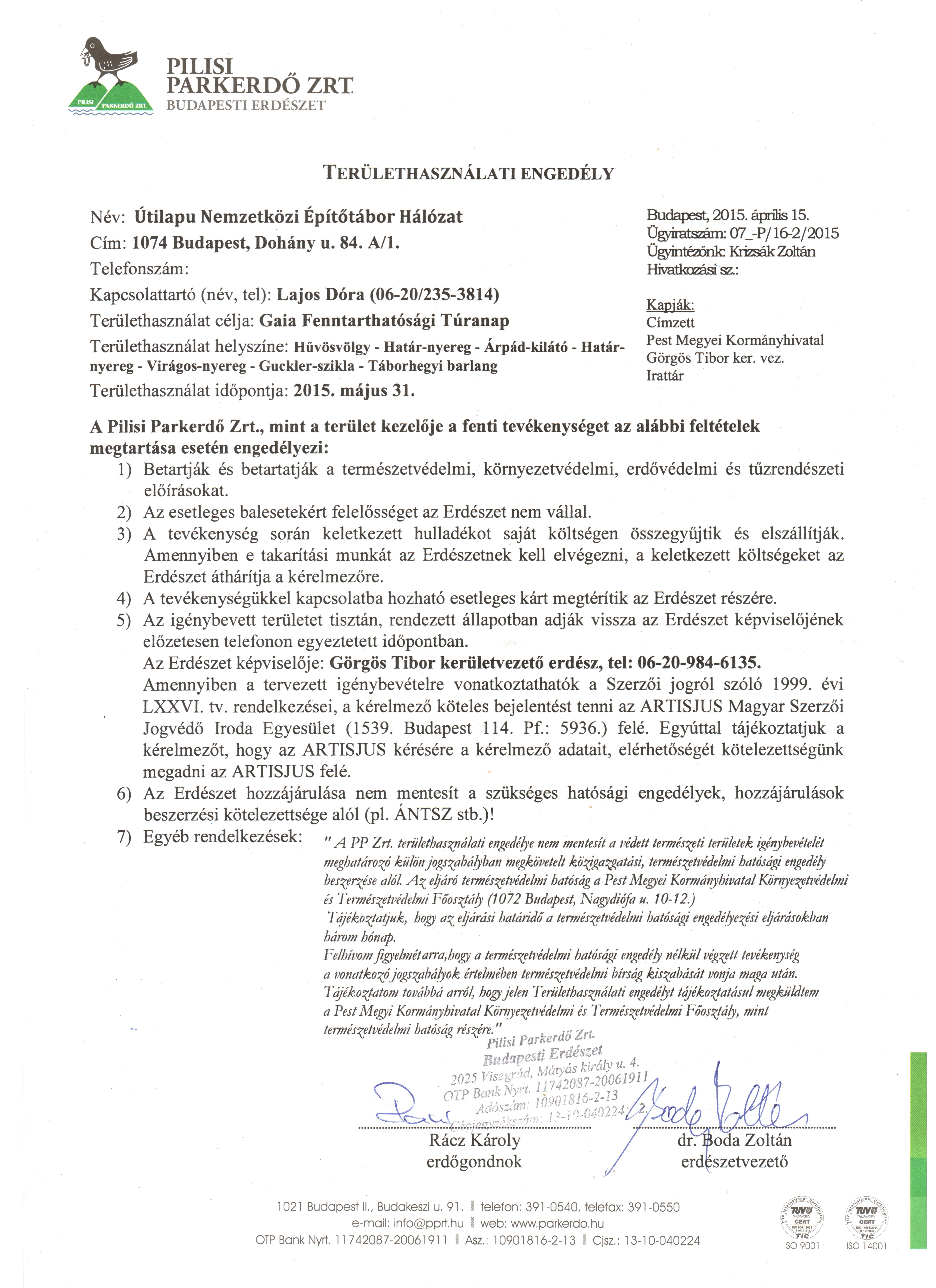 A Pilisi Parkerdő Zrt. erdőgazdálkodói területhasználati engedélye