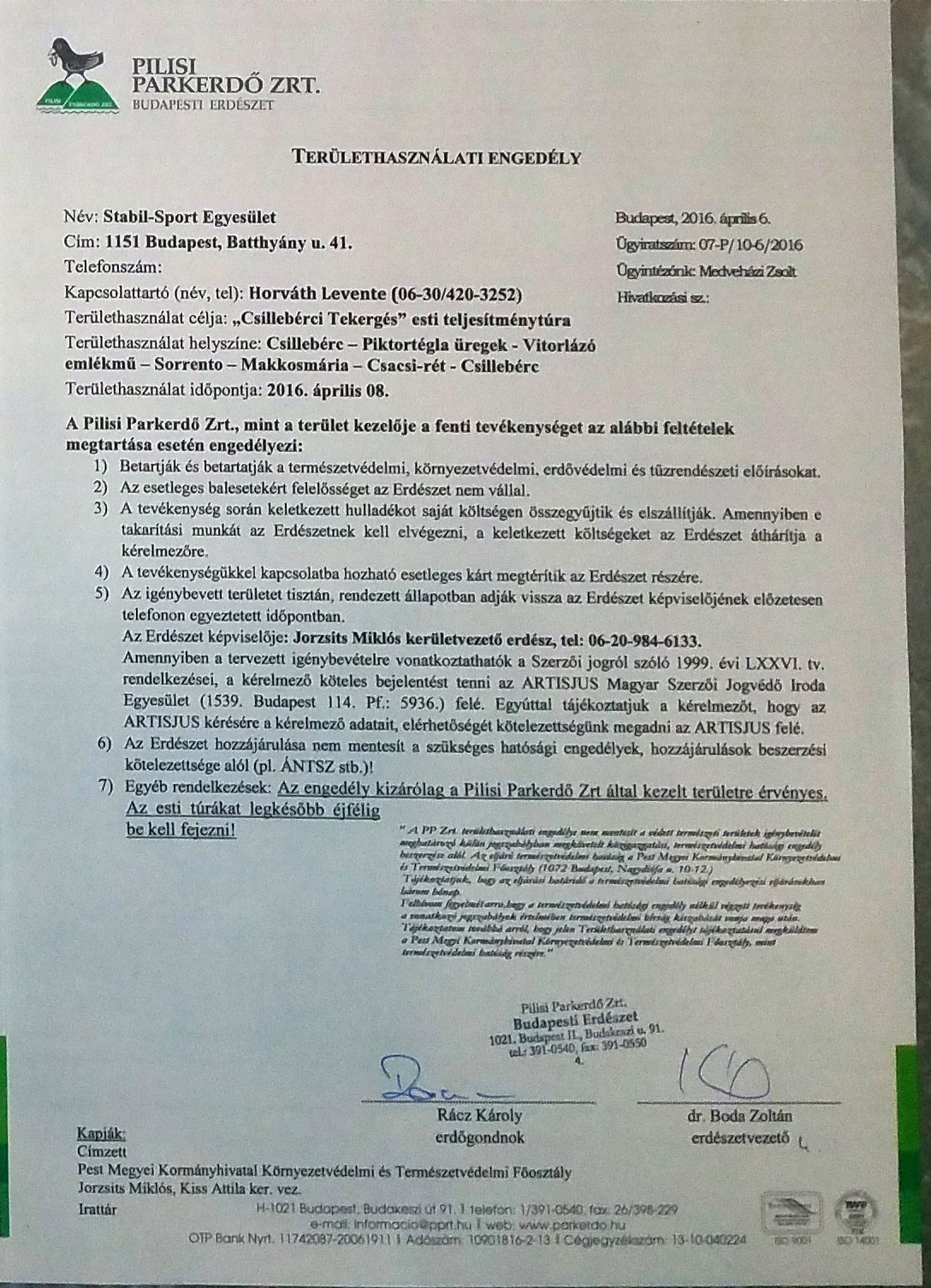 A Pilisi Parkerdő Zrt. erdészeti területhasználati engedélye (2016.)