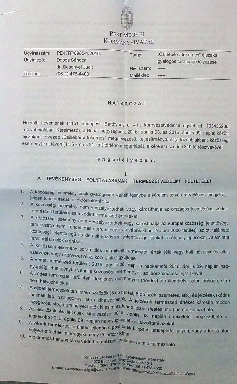 A Pest Megyei Kormányhivatal Környezetvédelmi és Természetvédelmi Főosztály természetvédelmi engedélye (2016.)
