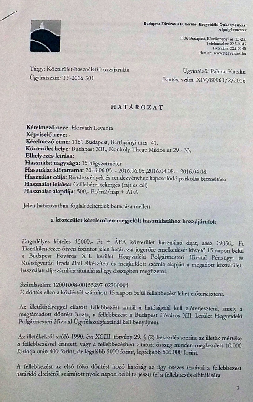Budapest Főváros XIII. kerület Hegyvidéki Önkormányzat közterület-használati engedélye (2016.)