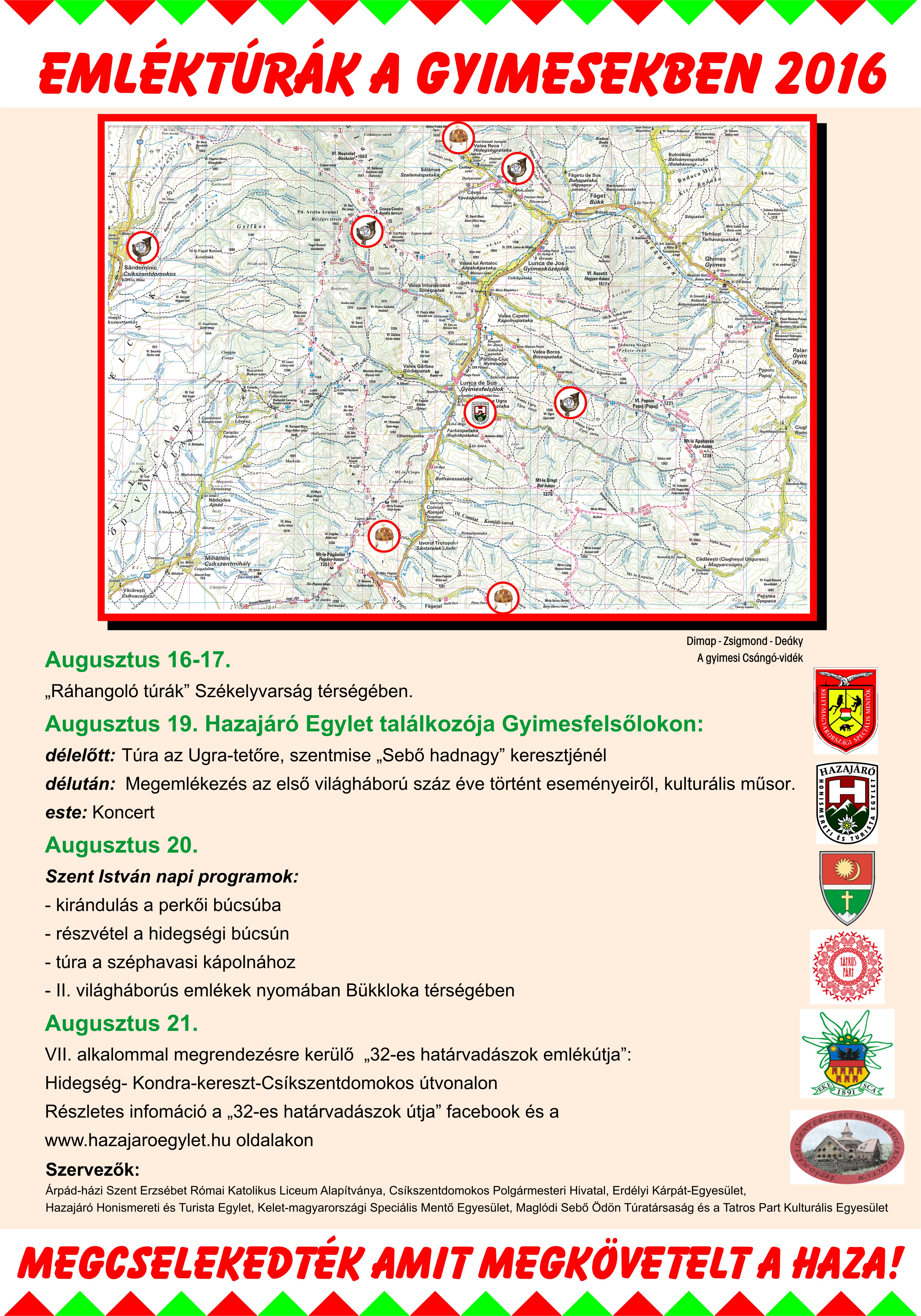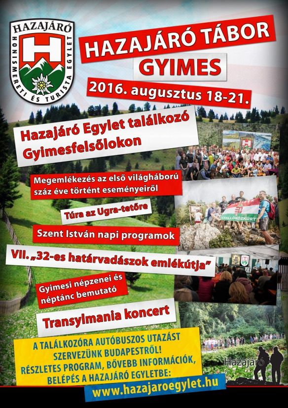 Örömmel jelentjük, hogy a Hazajáró Honismereti és Turista Egylet is elkészítette a a gyimesi nyári tábor plakátját, melyet a http://hazajaroegylet.hu/hazajaro-tabor-gyimes-2016/ linken megtaláltok. A programok kidolgozása folyamatos, hétről-hétre frissülni fog. Szeretettel és tisztelettel várjuk a jelentkezőket az Egylet rendkívül kedvező buszos utazásához, egyben kérjük segítségeteket a felhívás terjesztéséhez!